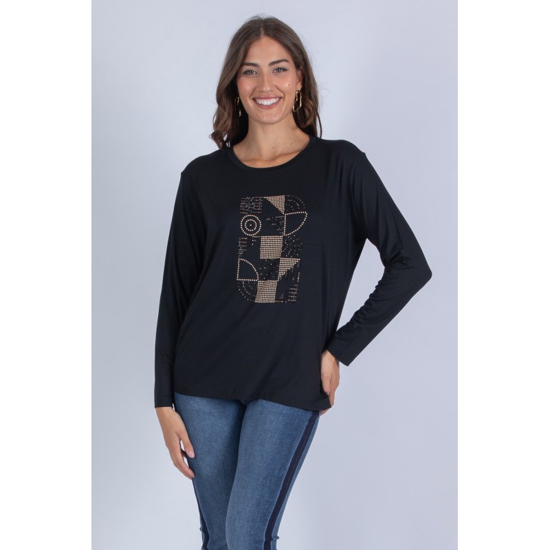 Illumina il tuo look con questa t-shirt in viscosa impreziosita da strass e borchie applicate, perfetta per aggiungere un tocco glam al tuo stile quotidiano. Realizzata in un tessuto morbido e leggero, offre comfort e vestibilità impeccabile, accompagnando con naturalezza ogni movimento.