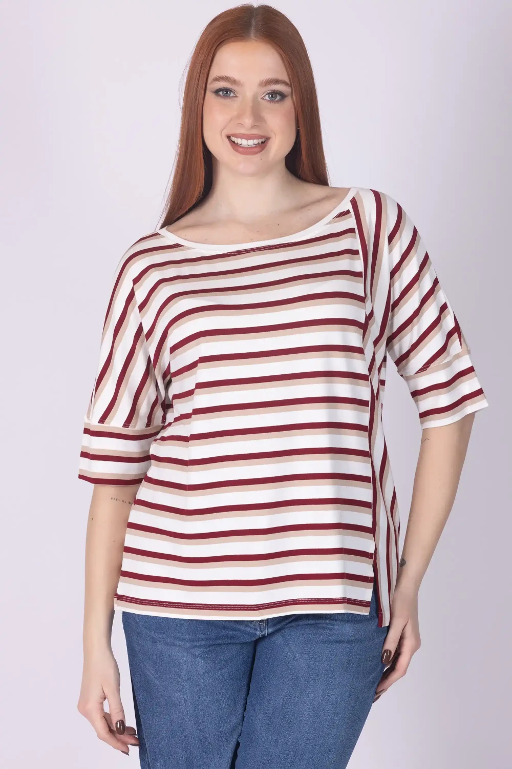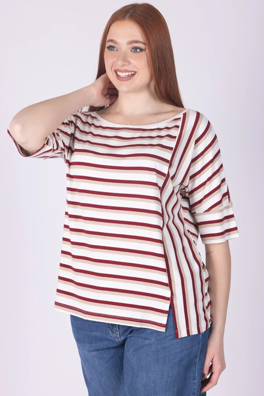 Dai dinamismo ai tuoi abbinamenti con questa t-shirt a mezza manica, caratterizzata da giochi di righe che donano movimento e personalità al design del capo.