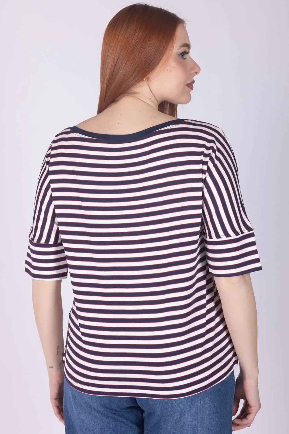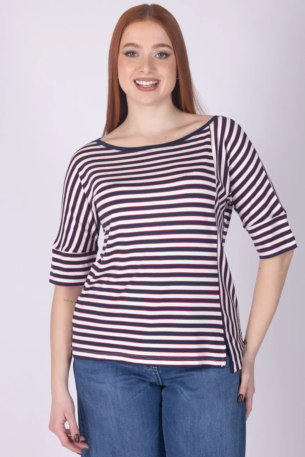 Dai dinamismo ai tuoi abbinamenti con questa t-shirt a mezza manica, caratterizzata da giochi di righe che donano movimento e personalità al design del capo.
