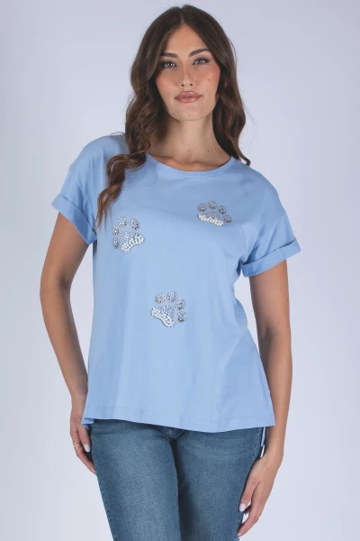 T-shirt in cotone a mezza manica, arricchita da zampette realizzate con strass e perle che creano un dettaglio luminoso e originale.