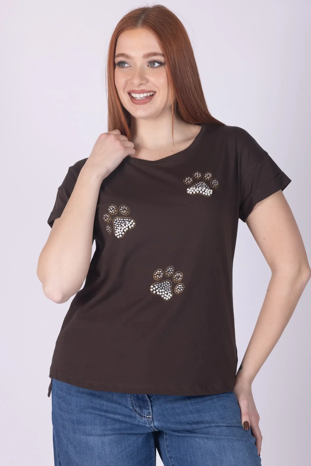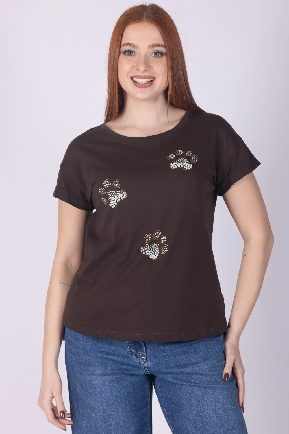 T-shirt in cotone a mezza manica, arricchita da zampette realizzate con strass e perle che creano un dettaglio luminoso e originale.