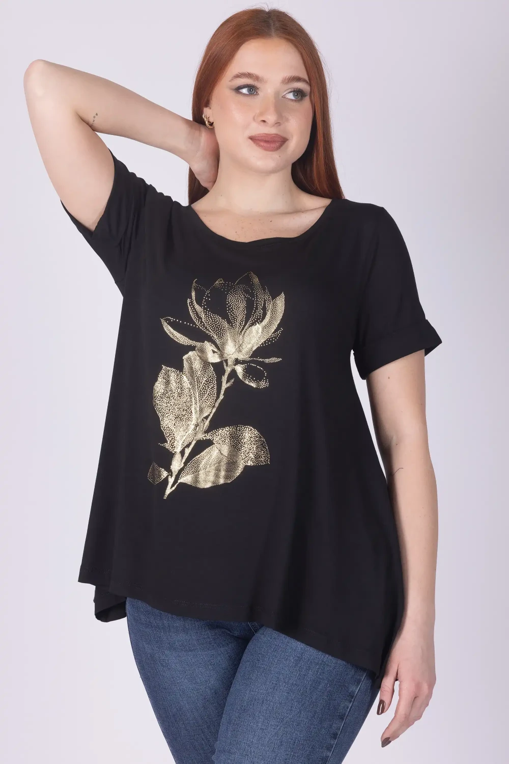 La linea morbida valorizza il movimento del tessuto, mentre la stampa floreale aggiunge carattere al design della maglia.