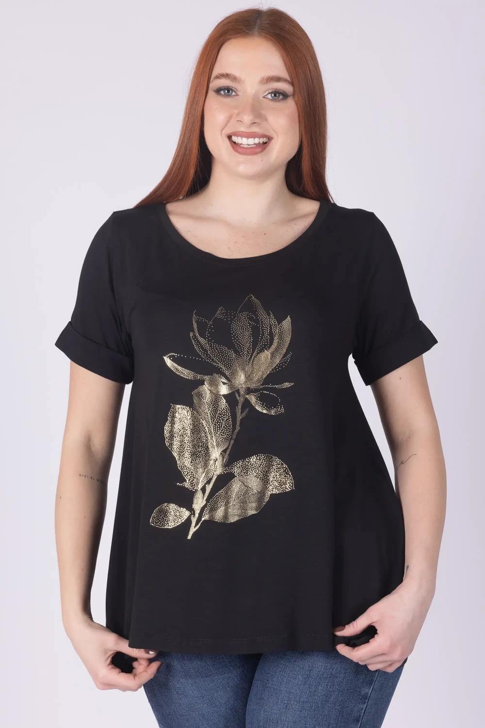 T-shirt girocollo a mezza manica dal modello svasato, arricchita da stampa fiori Maillard che dona al capo un tocco vivace e originale.