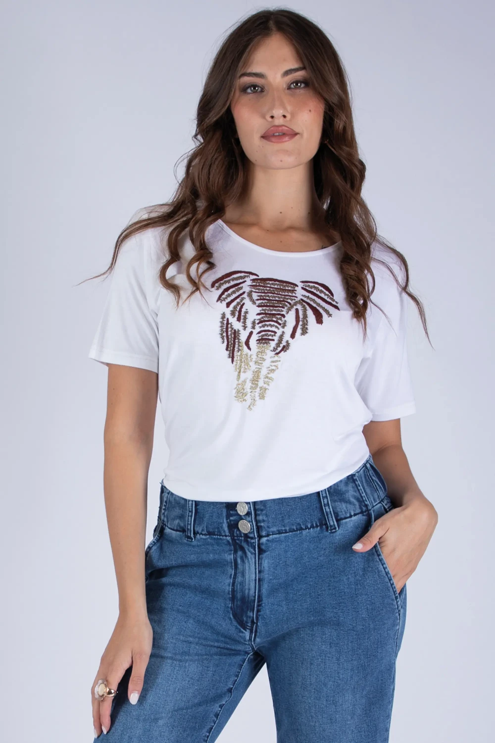 Dai un tocco speciale ai tuoi abbinamenti con questa t-shirt in viscosa girocollo a mezza manica, un capo essenziale arricchito da un dettaglio unico. Il design è impreziosito da elefante ricamato a mano, elemento delicato che dona personalità e carattere al modello. Il tessuto in viscosa elasticizzata garantisce morbidezza e comfort, offrendo una vestibilità piacevole che accompagna i movimenti con fluidità. Perfetta da abbinare a jeans, pantaloni o gonne, per creare look semplici ma curati. Sceglila per aggiungere un dettaglio artigianale e distintivo ai tuoi abbinamenti. Materiale: 95% viscosa, 5% elastan