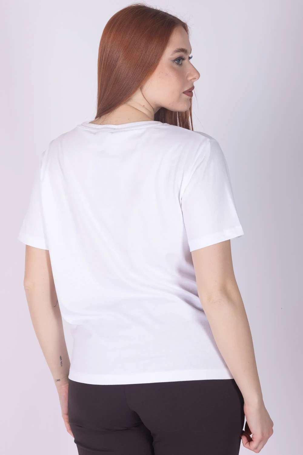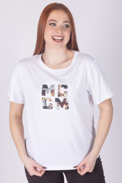 T-shirt a mezza manica realizzata in cotone, impreziosita da ricamo con micropaillettes multicolor che donano luce e vivacità al design.