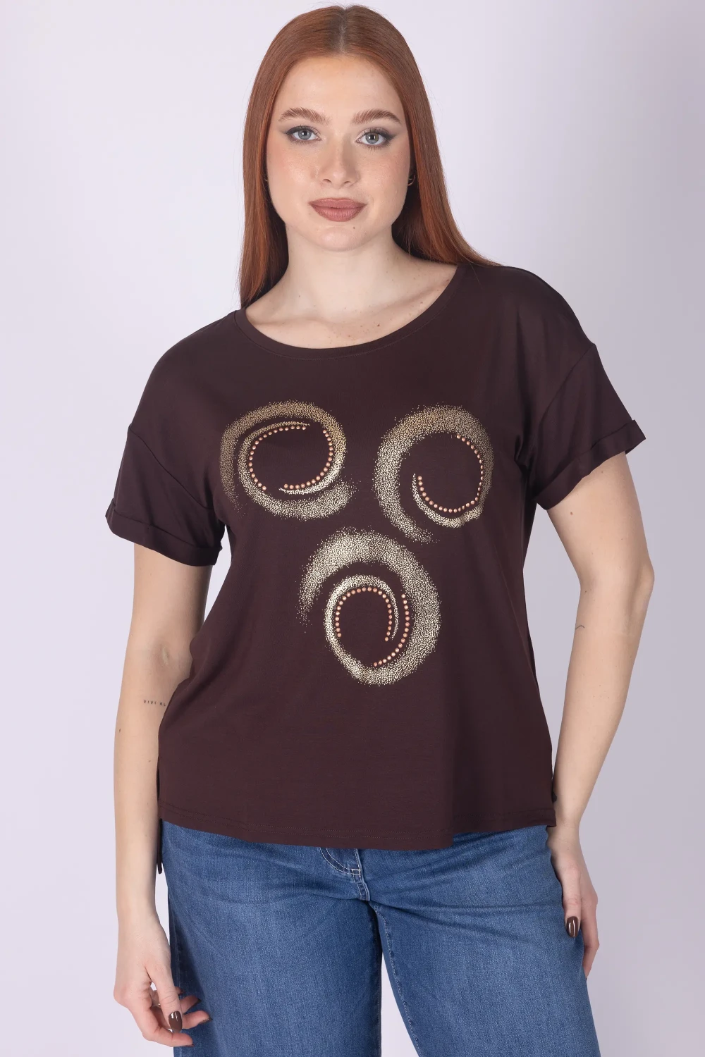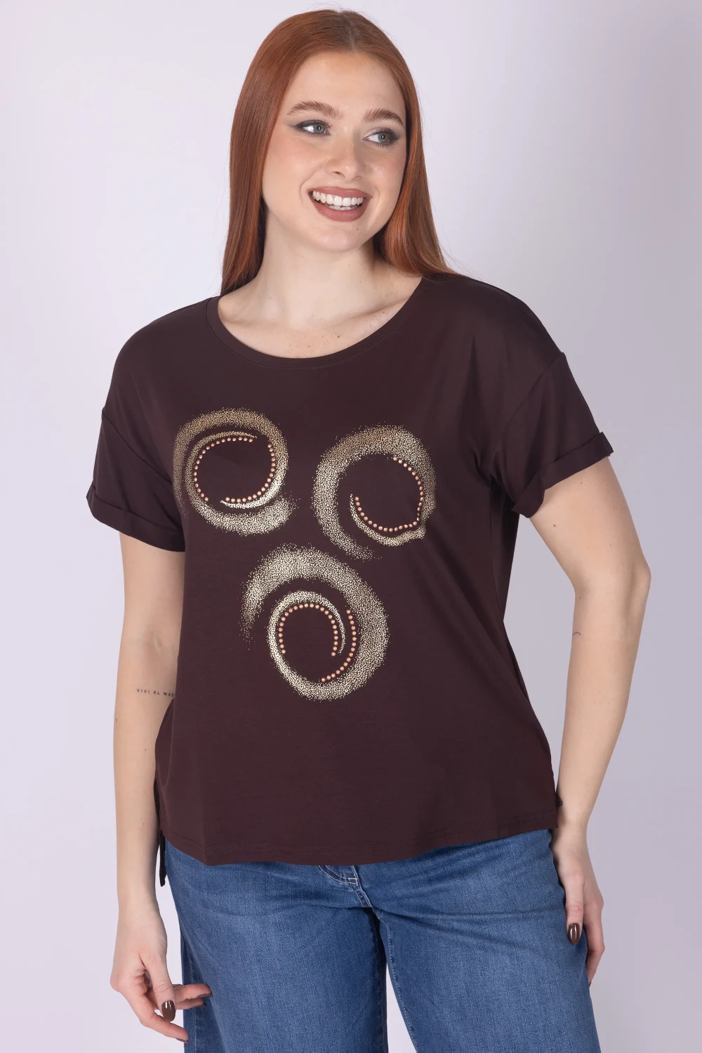 T-shirt in viscosa a mezza manica caratterizzata da fondo irregolare che dona movimento alla linea del capo. Il capo è arricchito da stampa aerografata con applicazioni tono su tono, dettagli che creano un effetto visivo originale e ricercato.