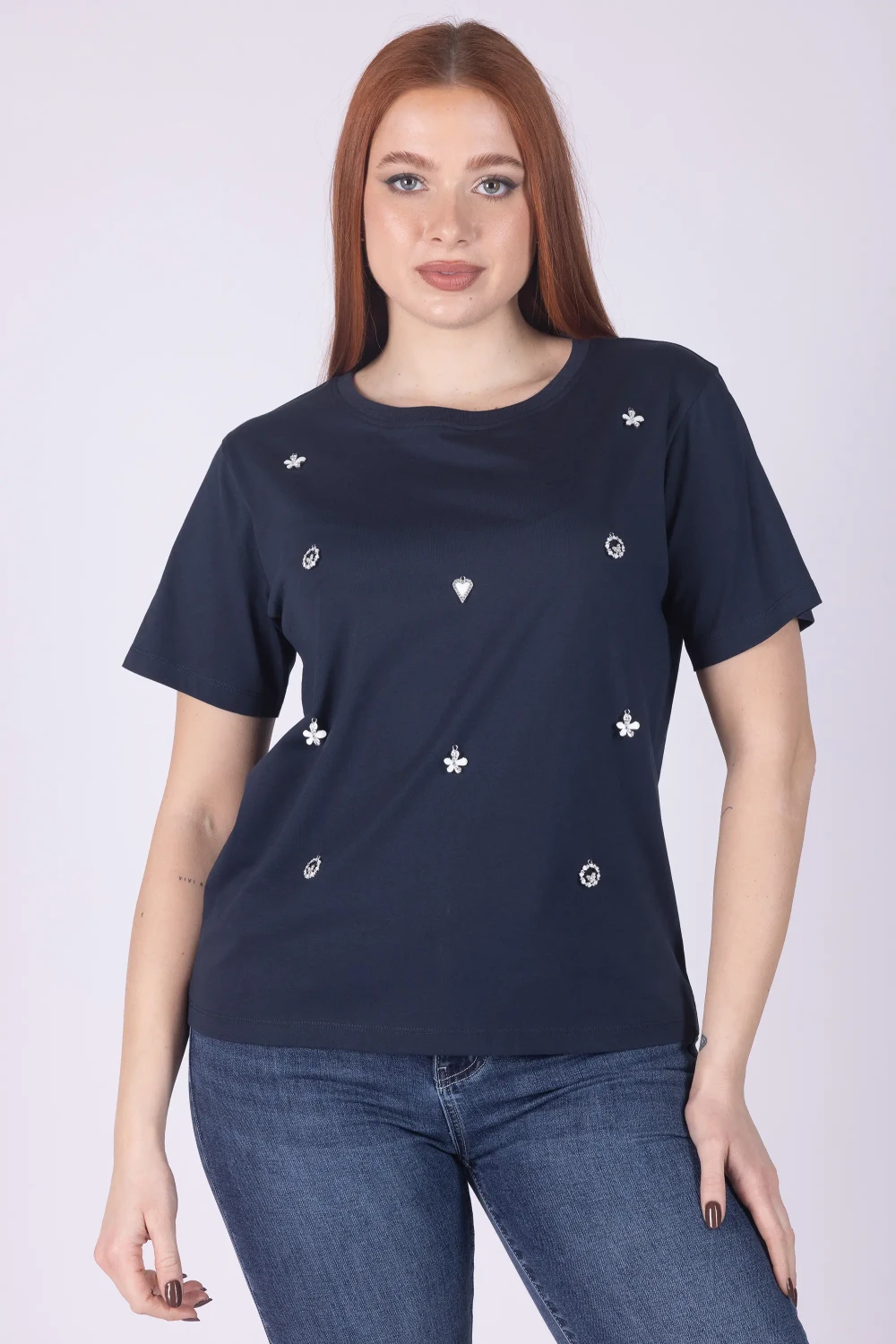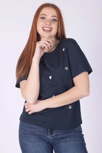 T-shirt girocollo a mezza manica, valorizzata da applicazioni in strass ricamati che donano luce e rendono il capo più particolare.