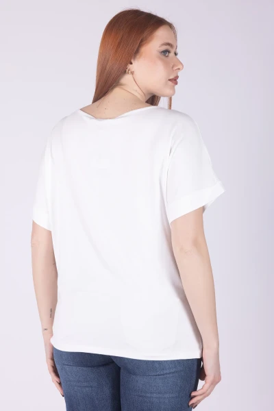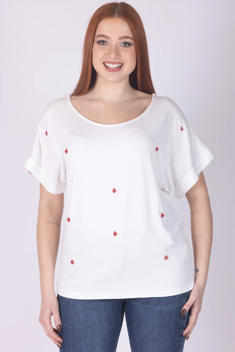 T-shirt in viscosa a mezza manica caratterizzata da uno stile leggero e distintivo. Il modello è impreziosito da coralli ricamati, dettagli decorativi che rendono il capo particolare.
