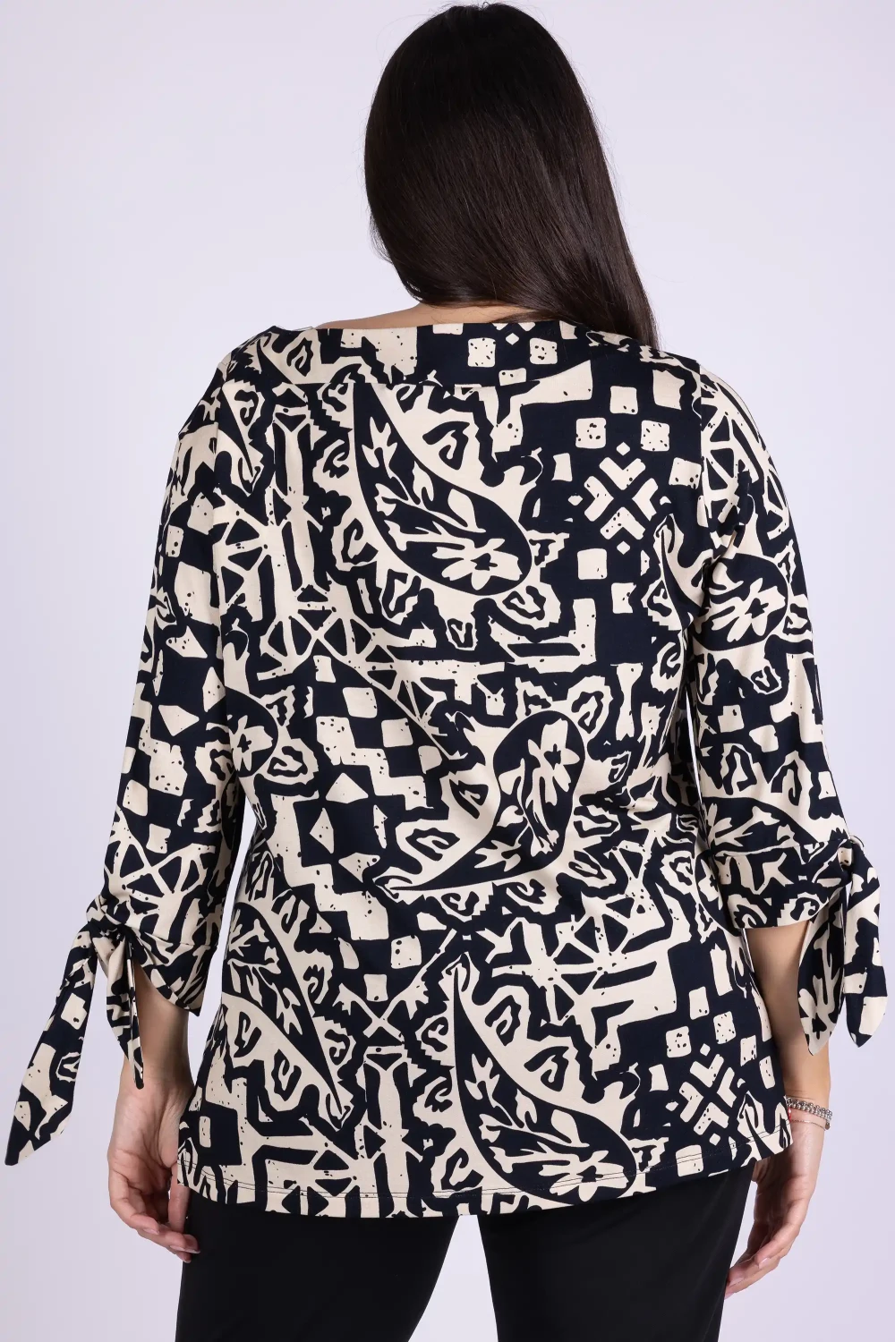 Rinnova i tuoi look con questa t-shirt in viscosa fantasia, un capo leggero e versatile pensato per accompagnare con stile la quotidianità. Il modello presenta girocollo e manica tre quarti con nodo, dettaglio che dona movimento e un tocco originale al design.