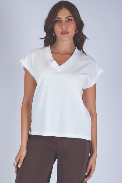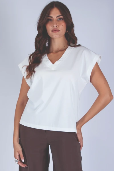 T-shirt scollo a V realizzata in tessuto morbido ed elasticizzato, pensata per offrire comfort e praticità. Il design essenziale valorizza la linea del capo, rendendolo facile da abbinare in diverse occasioni.