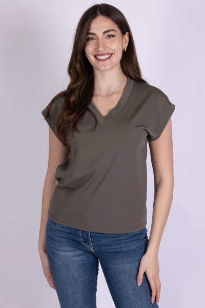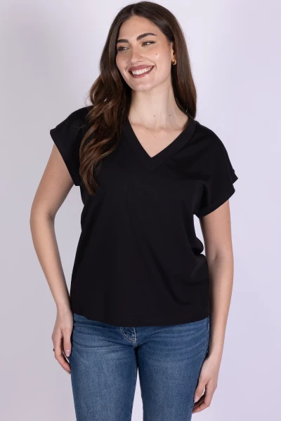 T-shirt scollo a V realizzata in tessuto morbido ed elasticizzato, pensata per offrire comfort e praticità. Il design essenziale valorizza la linea del capo, rendendolo facile da abbinare in diverse occasioni.