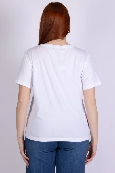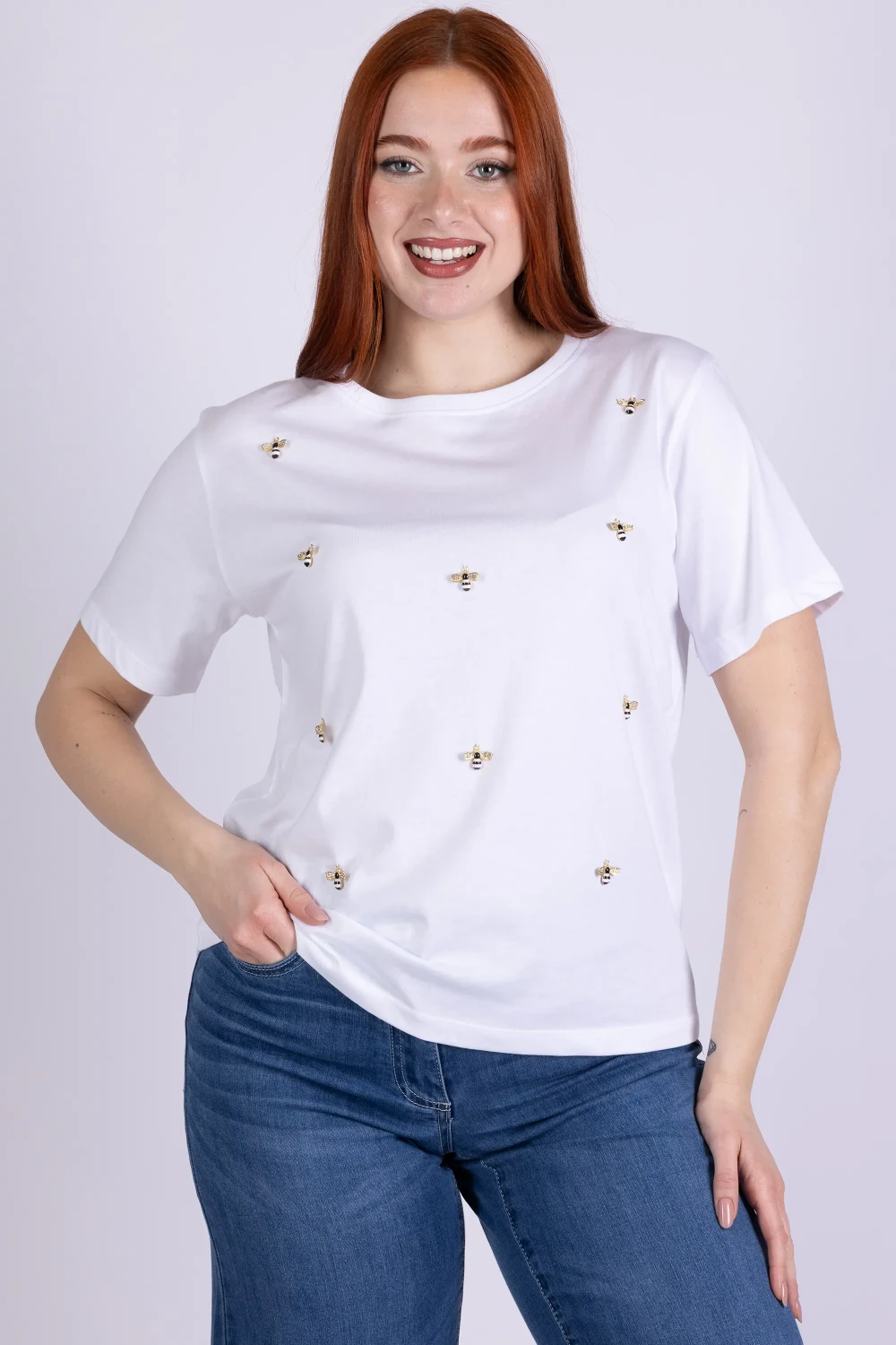 T-shirt girocollo a mezza manica realizzata in cotone, arricchita da api ricamate che aggiungono un dettaglio originale e decorativo al capo. I ricami creano un punto focale delicato, dando carattere alla maglia.