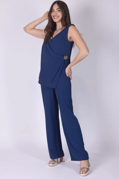 Tuta in cady dal design elegante, caratterizzata da giromanica e scollo a V che valorizzano la linea del capo. Il modello è completato da chiusura con zip invisibile sul retro e accessorio color oro, dettaglio luminoso che arricchisce il design.
