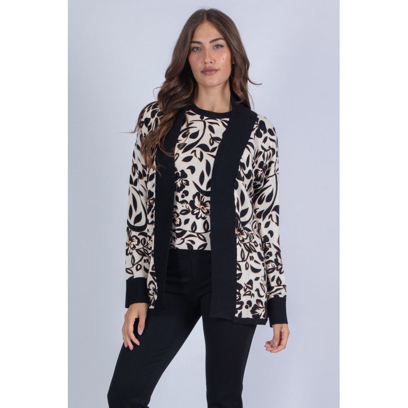 Dona un tocco di femminilità al tuo guardaroba con questo twin set floreale, composto da un cardigan sciallato dalla linea fluida e una mezza manica coordinata, entrambi caratterizzati da una vivace fantasia floreale. Il design avvolgente e i dettagli morbidi rendono questo completo perfetto per look eleganti ma confortevoli, ideali sia per l'ufficio che per il tempo libero. Un mix equilibrato tra stile romantico e praticità: indossalo per distinguerti con delicatezza. 70% viscosa 20% lana 10% elastan